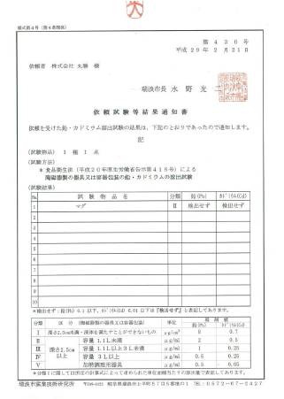 瑞浪市窯業技術研究所は、試験・研究開発・指導・受託業務などを行っている公的機関です。主に行われている、鉛・カドミウム溶出検査の他にもさまざまな検査に対応可能です。